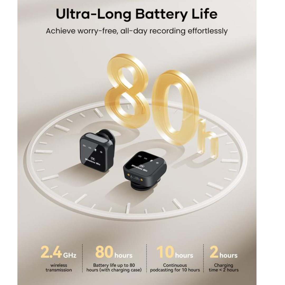Gracias a la avanzada tecnología de reducción de ruido, el ruido de fondo se minimiza para que tu voz destaque. El estuche carga los micrófonos rápidamente en menos de 2 horas y prolonga la duración de la batería hasta 80 horas, ideal para largas sesiones de grabación o filmaciones al aire libre.